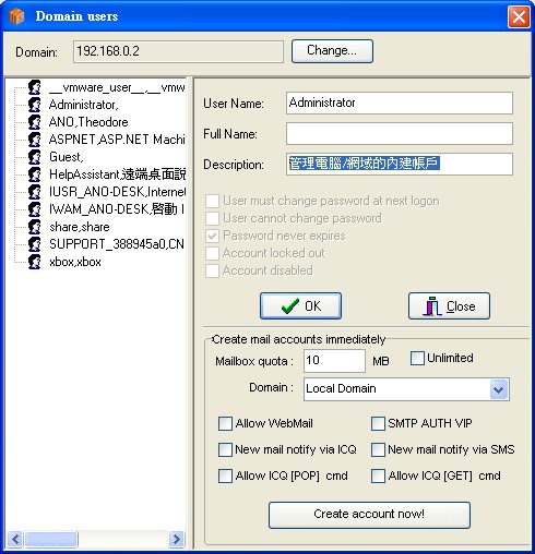 PS: If you wish to add some accounts belong to AD or PC, you could click [Browse AD account] to browse them and import them into raidenmaild. (not including password, the authentication will be processed in remote AD or PC).