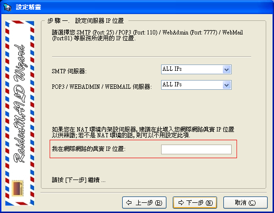 此頁面讓您設定轉寄的相關設定, 預設選項幫您啟用了智慧型轉寄 (POP before SMTP) 功能及SMTP身份驗證的功能, 此為建議選項. 按 [下一步] 繼續.