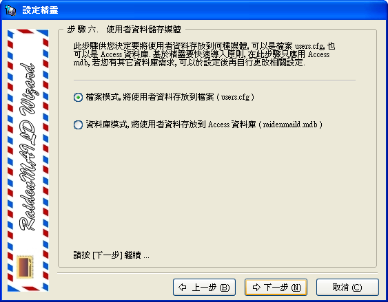 選擇您想用的使用者資料儲存方式後按 [下一步] 繼續.