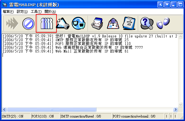 這是雷電MAILD 的主畫面. 正常的狀況您會看到各項服務都正常啟動, 不然您會看到啟動失敗的訊息.