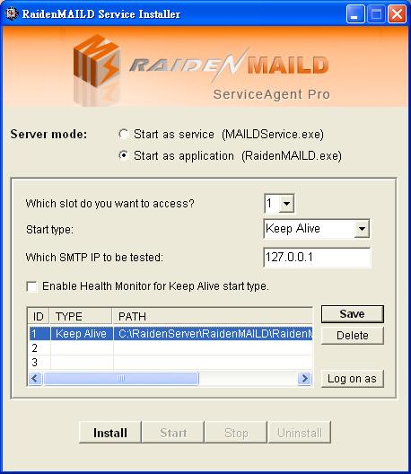 After version 2.1, service installer provides two modes to start RaidenMAILD. One is service mode (NEW mode), another is application mode.